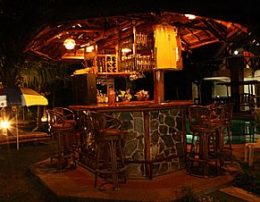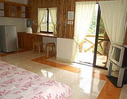 Each air-con bungalow features the following creature comforts: a fully equipped kitchen with gas stove, refrigerator, Satellite TV, king sized double bed, hot and cold shower and a private covered terrace where you can relax, unwind and chill-out with cold drinks from our pool bar after a hot day in the tropical sun.